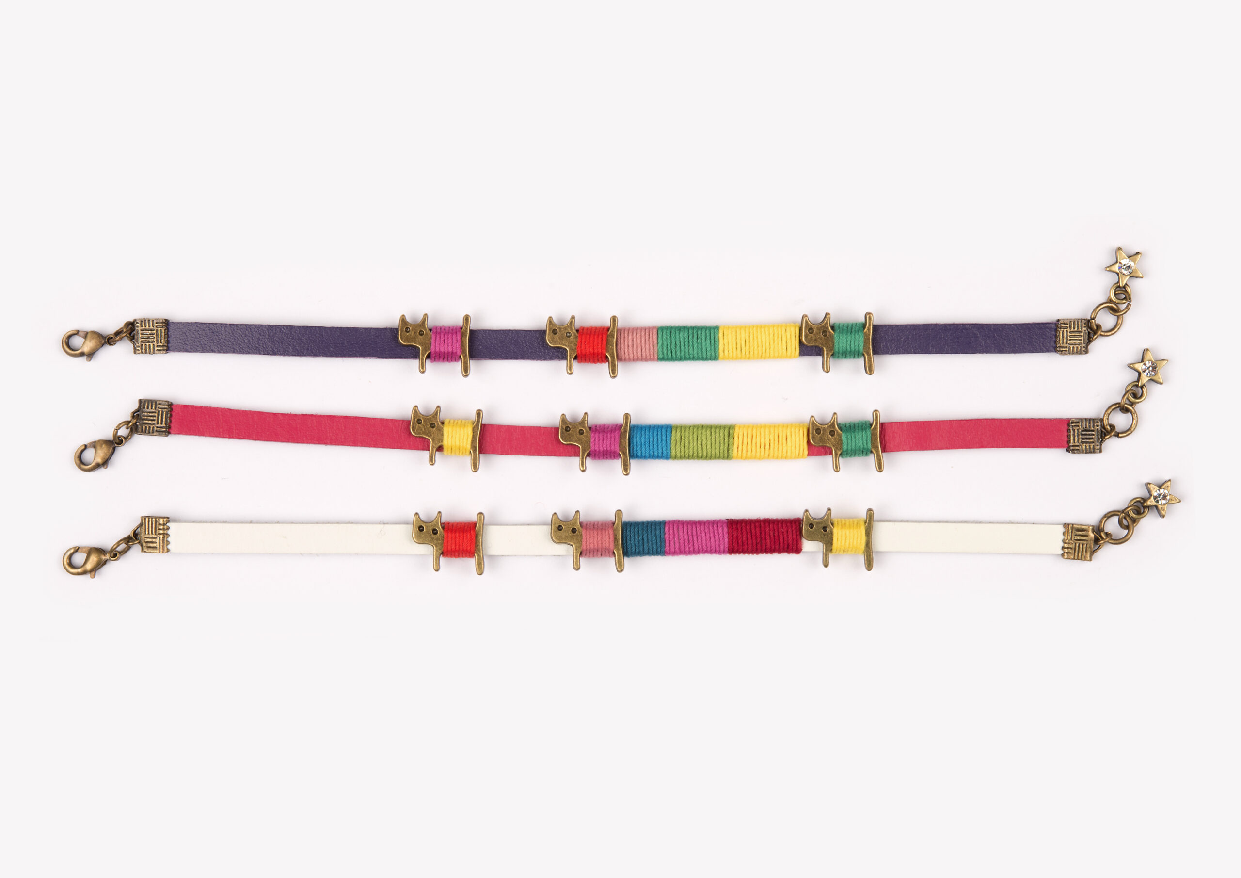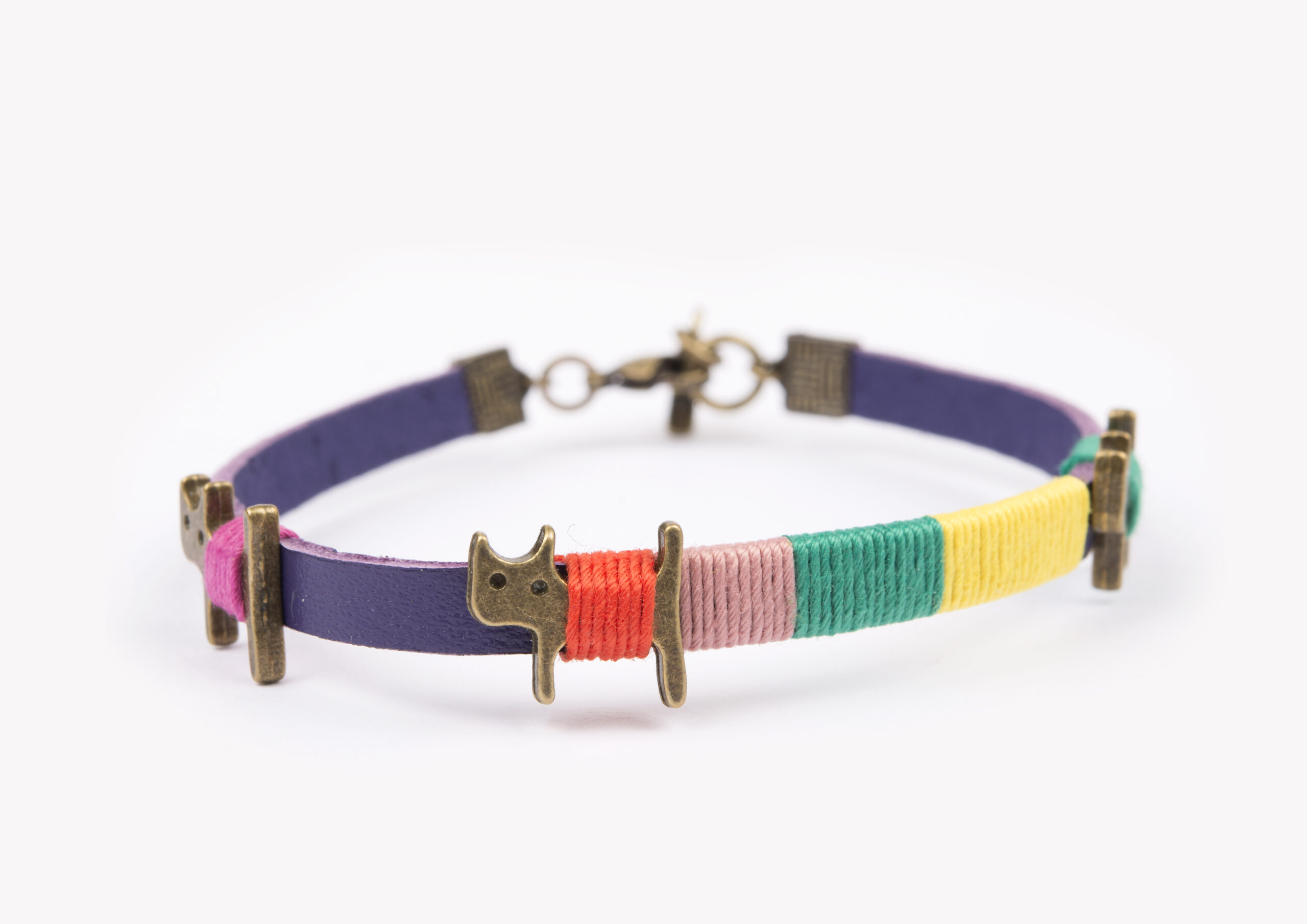 Die Katzen sind mit bunten Baumwollfäden um das Lederarmband gewickelt.