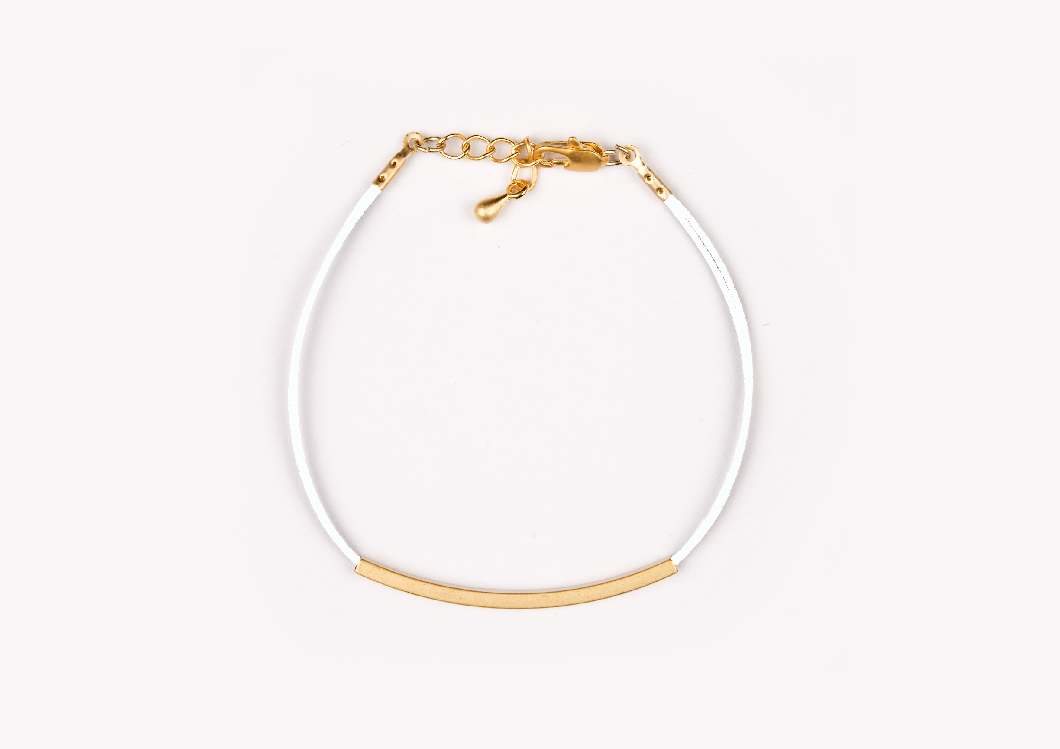Filigranes Armband aus zwei dünnen Kunststoffbändchen und dekorativem Element in der Mitte.