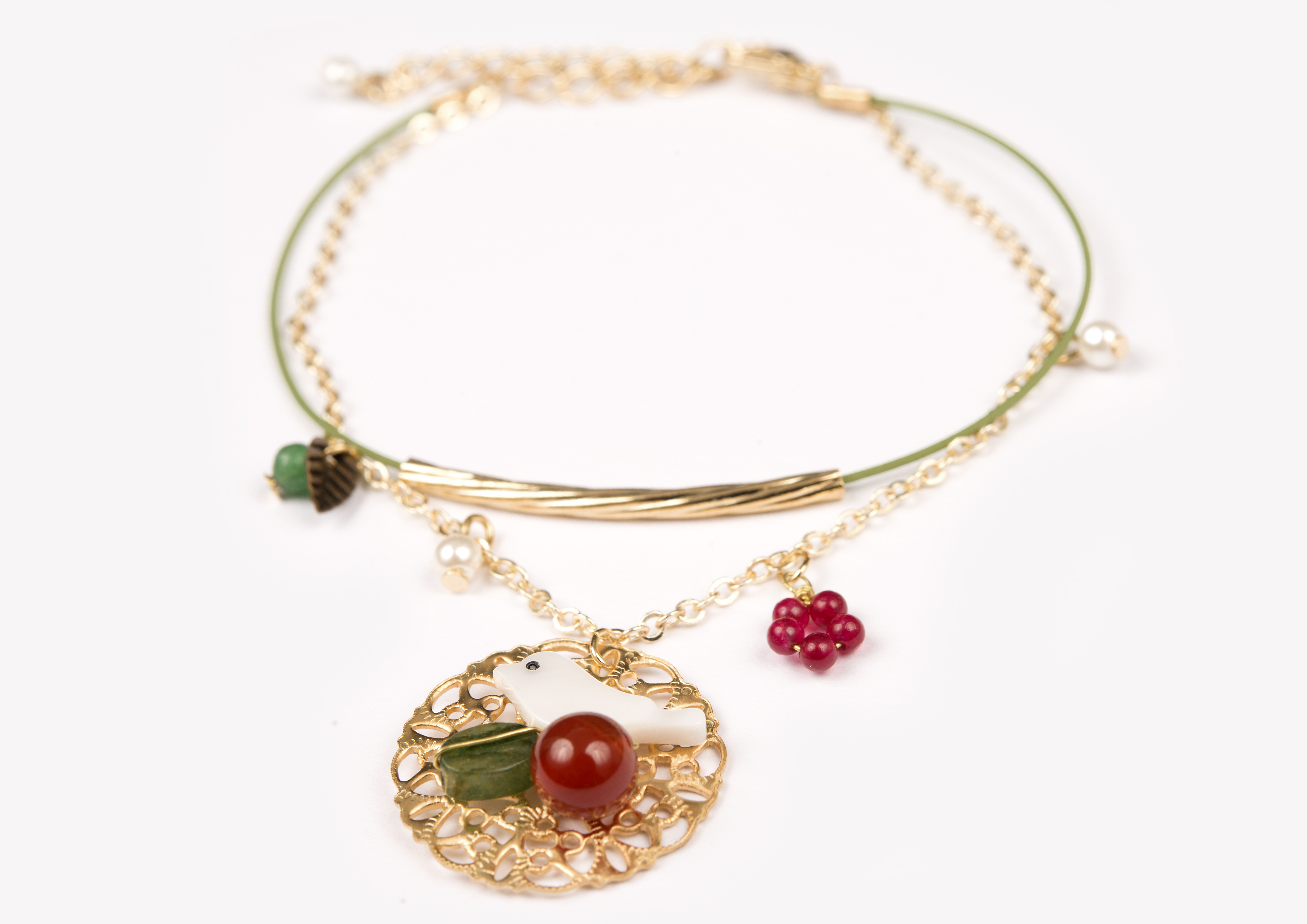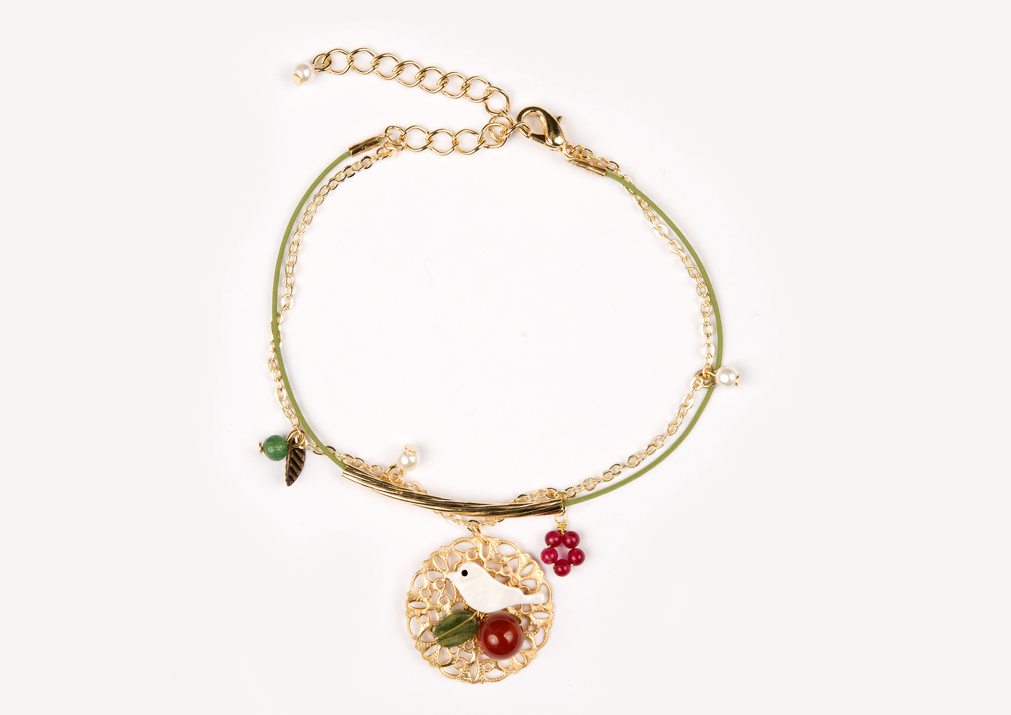 Süßes Armband, mit Liebe zum Detail gearbeitet. Der Anhänger ist mit Halbedelsteinen und einem Vogel aus Perlmutt verziert.