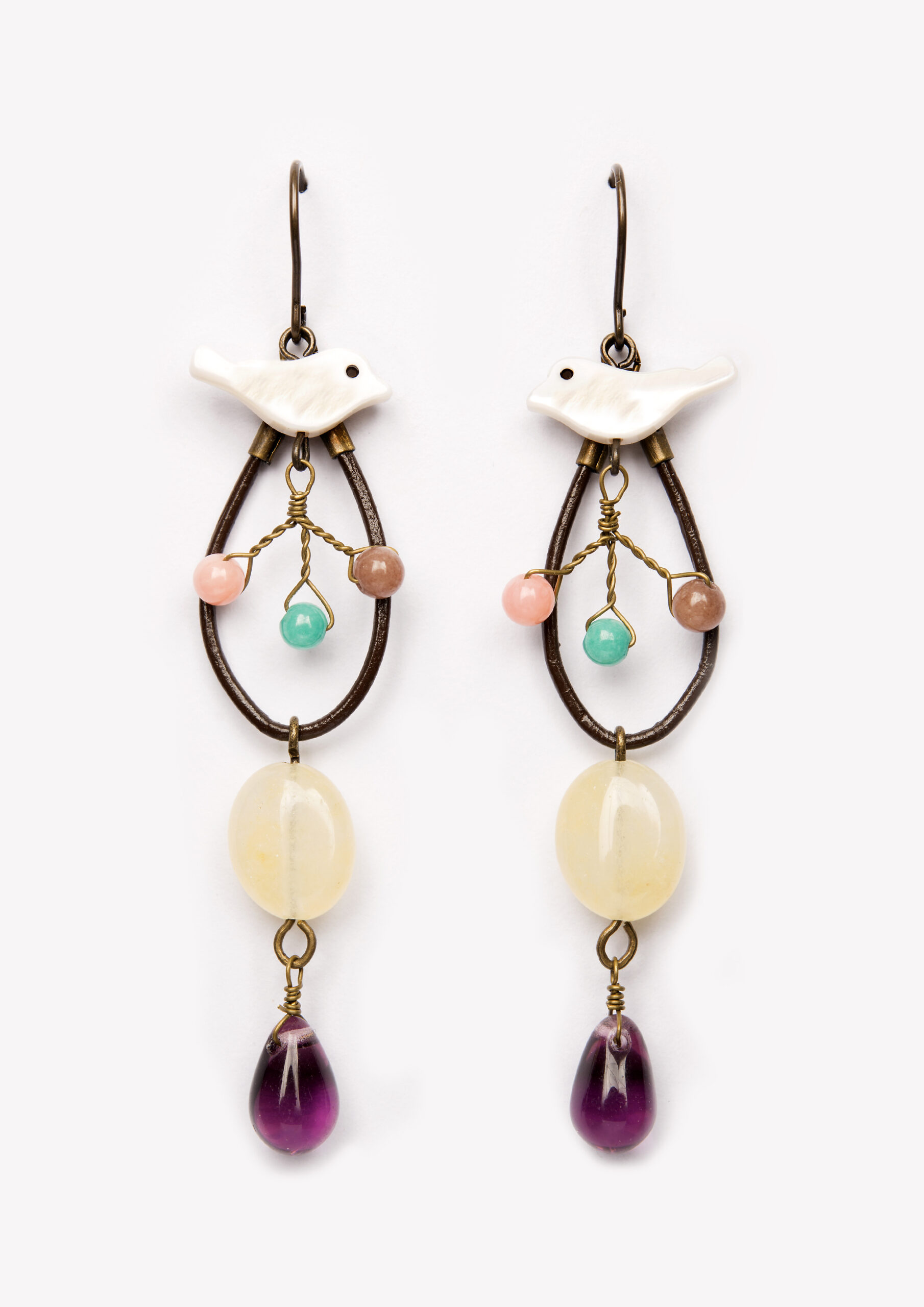 Filigraner, mit Liebe zum Detail gearbeiteter Ohrhänger im Kawaii-Stil mit Vögelchen aus Perlmutt, Schmucksteinen, Halbedelsteinen und Echtlederelementen.